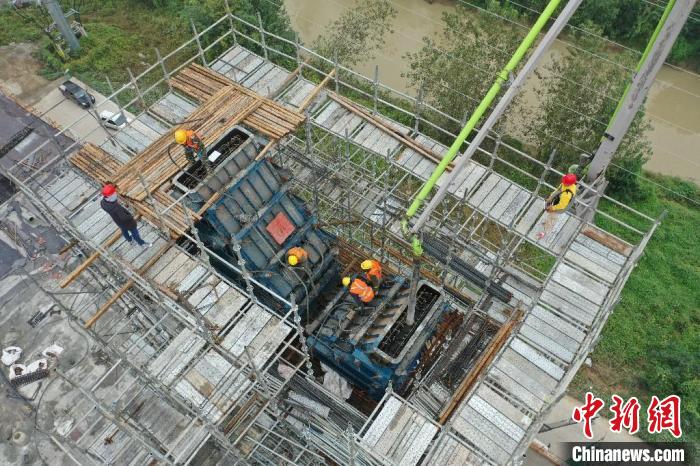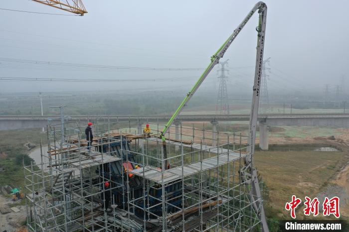 在引江濟(jì)淮工程江淮溝通段玉蘭大道橋主塔封頂施工現(xiàn)場(chǎng),工作人員正在緊張而有序地施工。 韓翔 攝