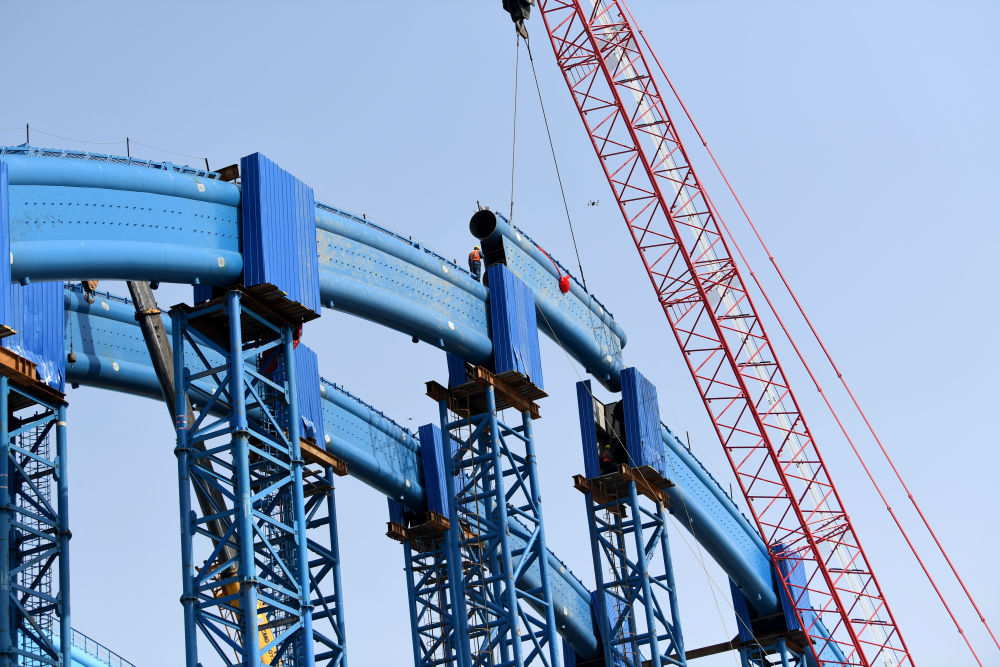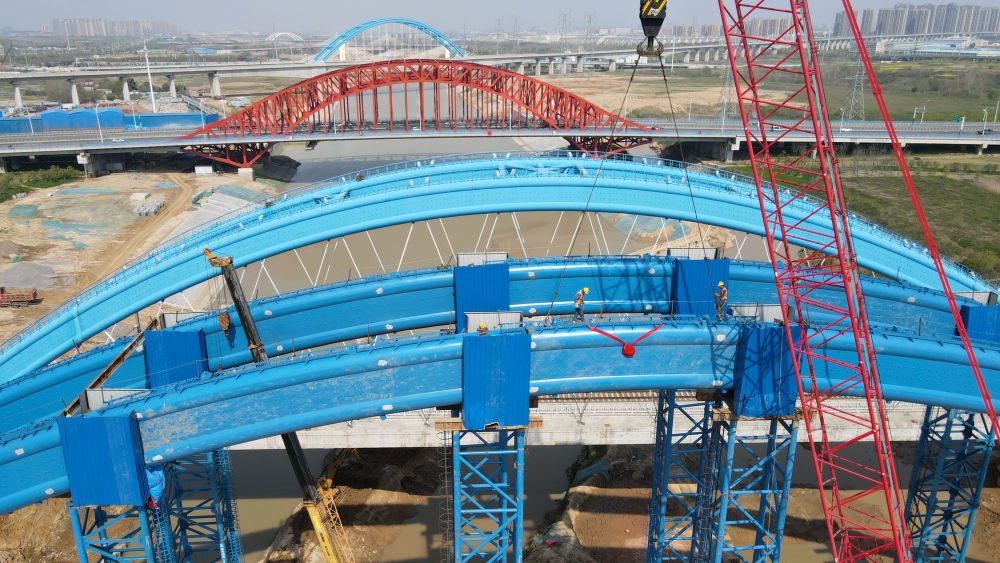↑這是中鐵四局引江濟淮合九鐵路改建工程特大橋系桿拱合龍施工現場(4月2日攝)。新華社記者 劉軍喜 攝影報道