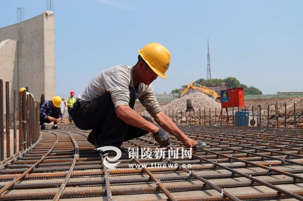 5月2日,記者在引江濟(jì)淮工程樅陽(yáng)樞紐節(jié)制閘施工現(xiàn)場(chǎng)看到,大型挖掘機(jī)、工程運(yùn)輸車(chē)等大型機(jī)械和施工人員正緊張有序作業(yè)。正在和工友們一起用鐵絲綁扎雷諾護(hù)墊,鋪設(shè)防沖槽的瓦工何池玉告訴記者,他來(lái)自安慶市迎江區(qū),今年因疫情影響沒(méi)有到外省務(wù)工,而是選擇參與到引江濟(jì)淮工程樅陽(yáng)樞紐的建設(shè)。“這個(gè)工程重大,質(zhì)量要求也高,工期又很緊,最近一段時(shí)間大家都是加班加點(diǎn)地在工作,‘五一’期間沒(méi)有一個(gè)回家的,確保按時(shí)按質(zhì)按量地完成每一項(xiàng)工作。”